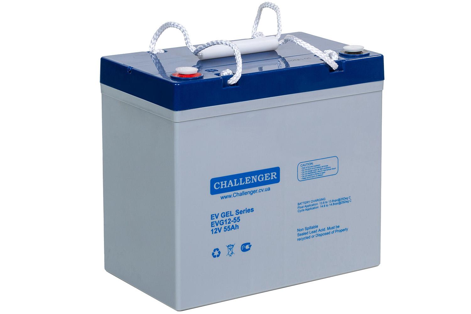Аккумуляторная батарея Challenger EVG12-55 является герметизированной необслуживаемой свинцово-кислотной АКБ, изготовленной по технологии GEL (желеобразный электролит). Так же нужно подметить, что данная батарея по своему конструктивному устройству относится к классу VRLA (клапанно-регулируемые свинцово-кислотные аккумуляторы), что предполагает под собой высокую степень рекомбинации газов, благодаря чему не требуется измерение плотности электролита и долив дистиллированной воды. Аккумуляторные батареи Challenger серии G12 разработаны для полноценной работы в цикличном режиме – до 400 циклов при 100% DOD.