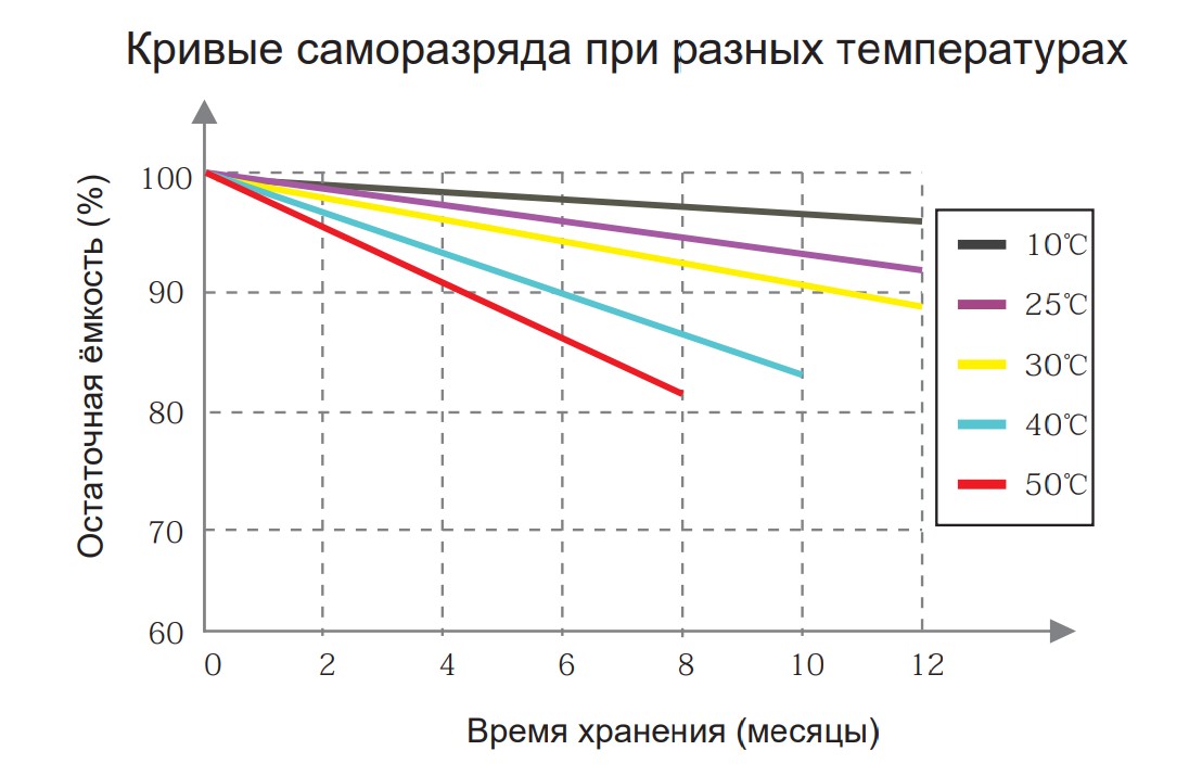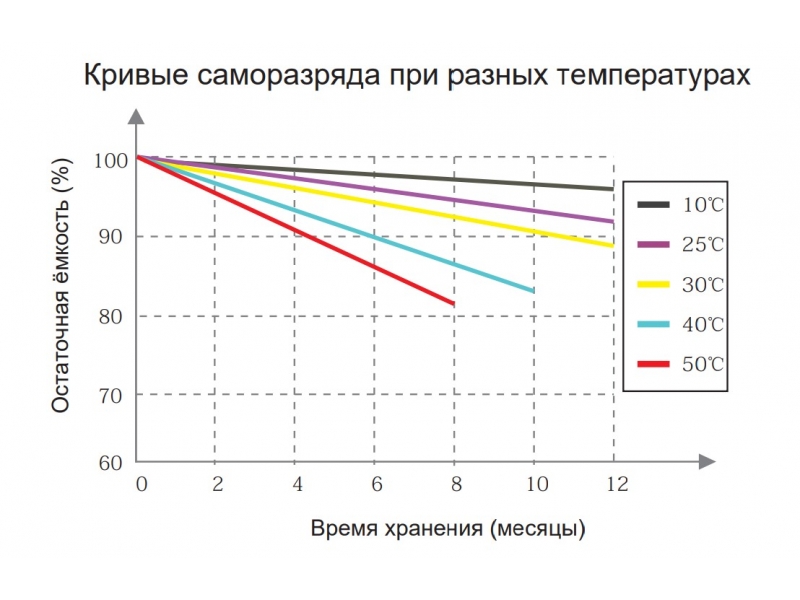 Срок хранения литий-железо-фосфатной батареи EverExceed может достигать 2 года без освежающего подзаряда. Для свинцово-кислотных батарей, как правило, требуется освежающий заряд каждые 6 месяцев во время хранения, иначе произойдет сульфатация и повреждение аккумулятора.