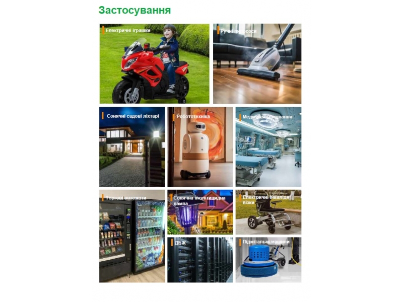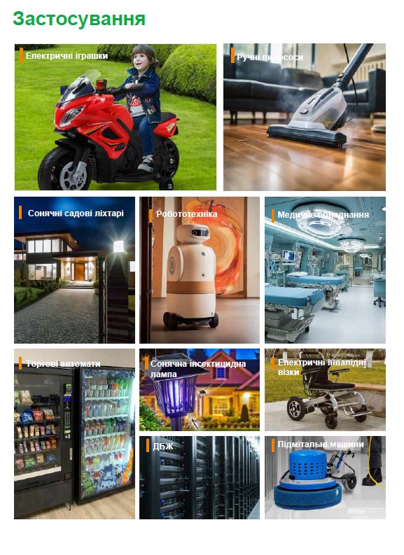 Данный тип АКБ имеет длительный срок эксплуатации (>6000 циклов заряда-разряда), низкие показатели саморазряда, компактный размер и меньший вес, а также обладают высокой токоведачей и зарядной способностью по сравнению со свинцово-кислотными АКБ. Широкий диапазон рабочих температур –20 ~ +60°C.