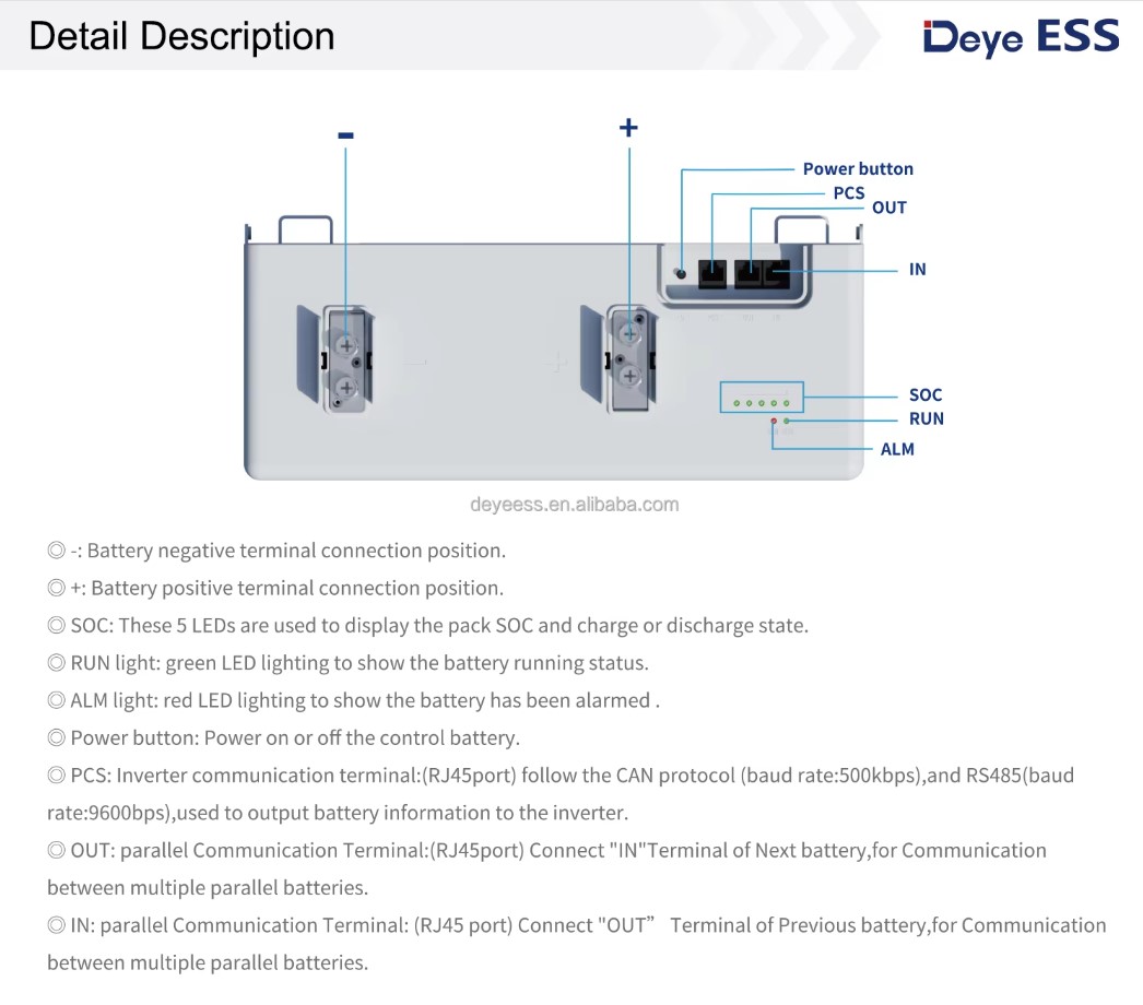 - Адаптивность и мониторинг: Встроенные светодиодные индикаторы (состояние заряда, работы и сигнализации) обеспечивают видимость в режиме реального времени. Благодаря связи CAN2.0, RS485 и Bluetooth, система безупречно интегрируется с инверторами и локальным мониторингом через приложение Deye, предоставляя вам полный контроль над накопителем энергии в сети.