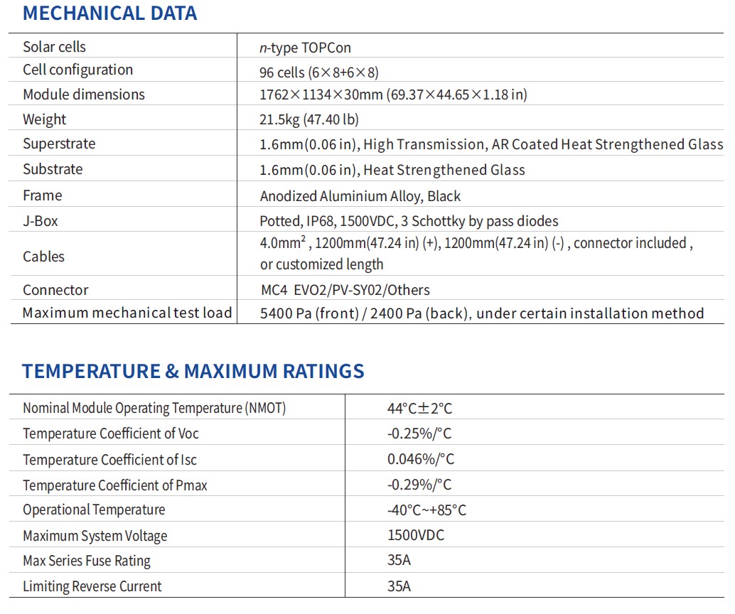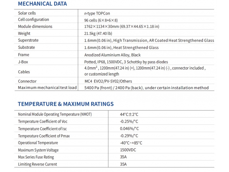 Модель отличается отличными характеристиками в слабом освещении, низким температурным коэффициентом (-0,29%/°C) и защитой от деградации LID/PID. Это делает ее идеальным выбором для крышных и наземных СЭС в бытовом и коммерческом сегменте.