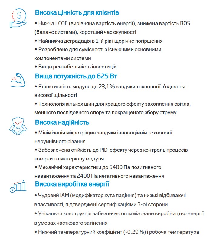 Солнечная панель 625 Вт Trina TSM-625M NE19R Vertex N – это высокопроизводительный фотомодуль, который идеально подходит как для бытового, так и коммерческого использования. Благодаря современным технологиям, таким как N-Type и i-TOPCon, она обладает повышенной эффективностью и долговечностью.