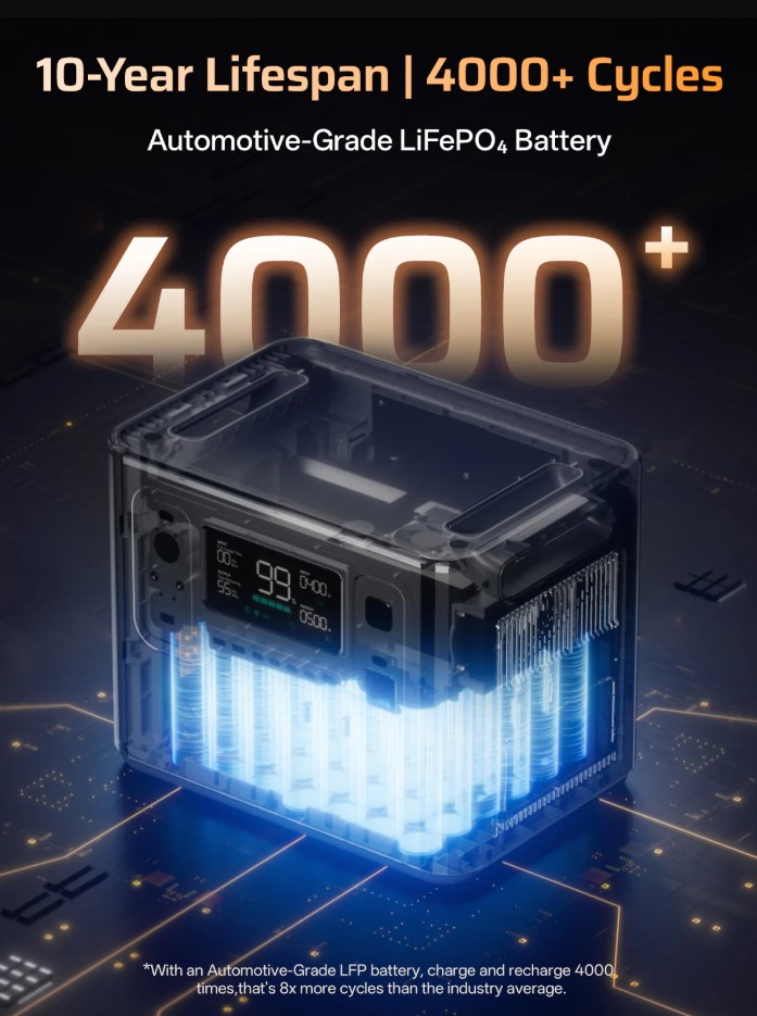 - Технология LiFePO₄ : безопасна, долговечна, более 3500 циклов заряд-разряд