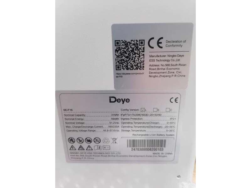Аккумуляторная батарея SE-F16-L от Deye – это мощный и надежный элемент современных систем хранения энергии. Модель разработана на основе литий-железо-фосфатной технологии LiFePO₄, которая обеспечивает стабильную работу, высокий уровень безопасности и длительный срок службы. Батарея имеет емкость 314 Ач, номинальное напряжение 51,2 В и общую энергоемкость 16,0 кВтч, что позволяет эффективно накапливать энергию для бытовых, коммерческих и промышленных систем.