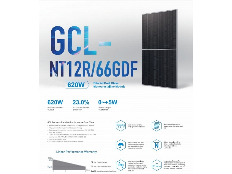 Фотоэлектрическая панель GCL-NT12R/66GDF-620 построена на базе новейших технологий, позволяющих максимально эффективно использовать доступную солнечную энергию. Технология Bifacial позволяет увеличить общий выход энергии, поскольку модуль собирает свет не только напрямую, но от поверхности под панелью. Это может быть особенно эффективно на светлых покрытиях с высоким коэффициентом отражения. Рама из алюминия и закаленное стекло обеспечивают надежную защиту от механических и климатических воздействий, таких как ветер или град.