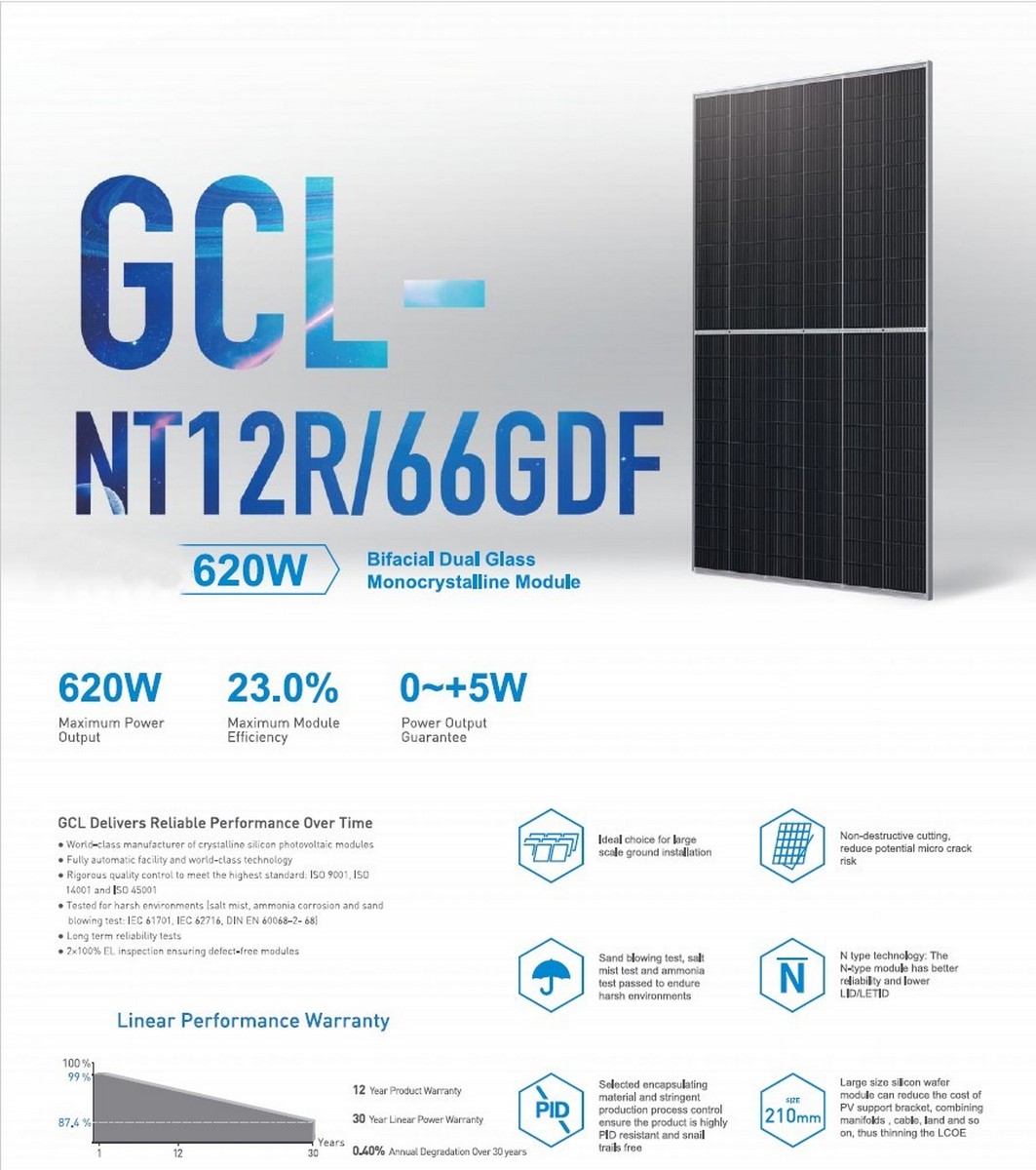 GCL Group GCL-NT12R/66GDF-620 – это мощная и эффективная солнечная панель с технологией Bifacial, объединяющая высокую производительность, надежность и стабильную работу для широкого спектра энергетических систем.