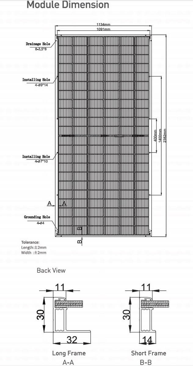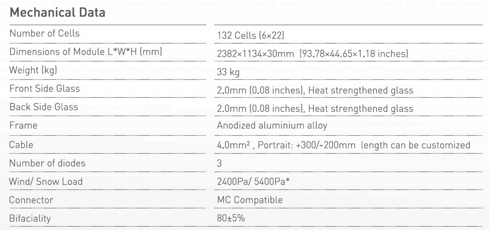 Панель изготовлена с использованием технологии двойного стекла, что повышает общую жесткость конструкции и устойчивость к механическим воздействиям. Алюминиевая рама в сочетании с полной герметичностью электрических соединений надежно предохраняет внутренние компоненты от влаги, пыли и сильных ветровых нагрузок. Такая конструкция рассчитана на длительную эксплуатацию в сложных погодных условиях без потери трудоспособности.