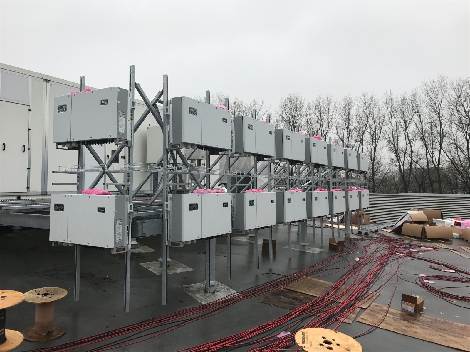 Трёхфазный инвертор с предохранителями постоянного тока и c устройством защиты от перенапряжения. Максимальная мощность 60 кВт. Шесть MPPT входов / 12 стрингов по 1100 вольт.