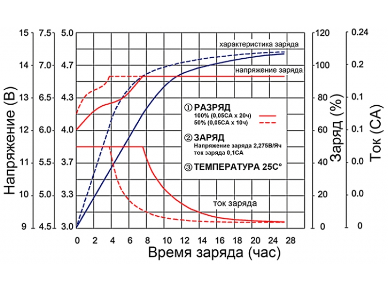| Напруга вирівнюючого і циклічного заряду, (при середній температурі 25°С) | 14,2 до 14,4 |