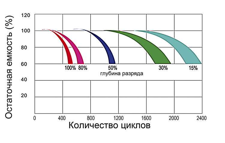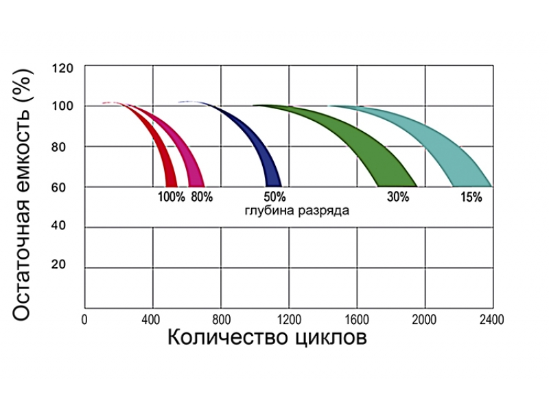 | Кількість циклів | Від 400 до 2400, залежно від глибини розряду (100%-20%) |