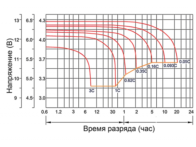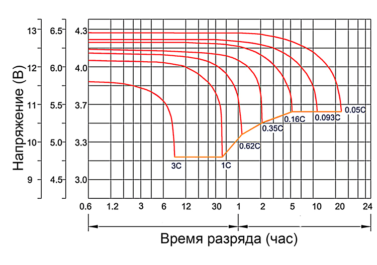 Важливо. Графіки розряду наведені для різних навантажень (від 0,05С до 3С) та мають обмеження кінцевої напруги (промальовано нижньою лінією). Подальший розряд батареї (нижче за мінімальний рівень - глибокий розряд), може призвести до виникнення незворотної сульфатації пластин, їх деформації, зменшення ємності та виходу батареї з ладу.