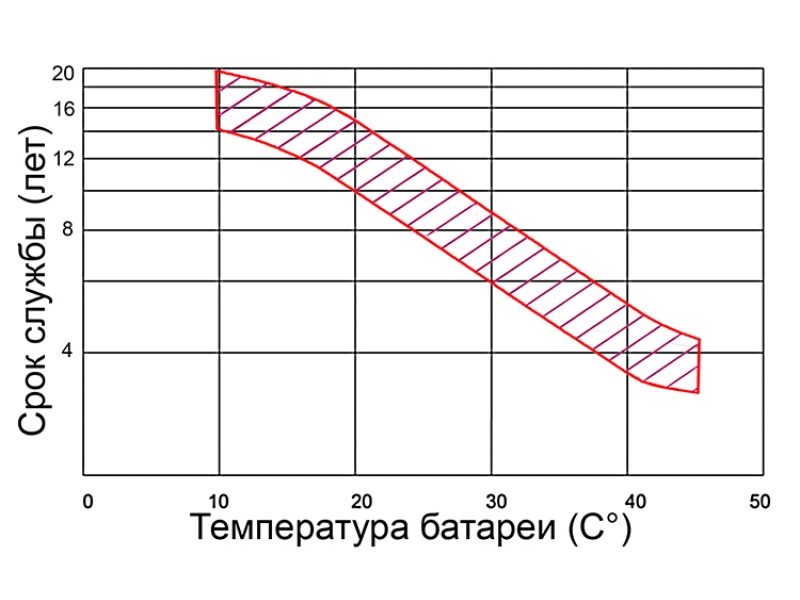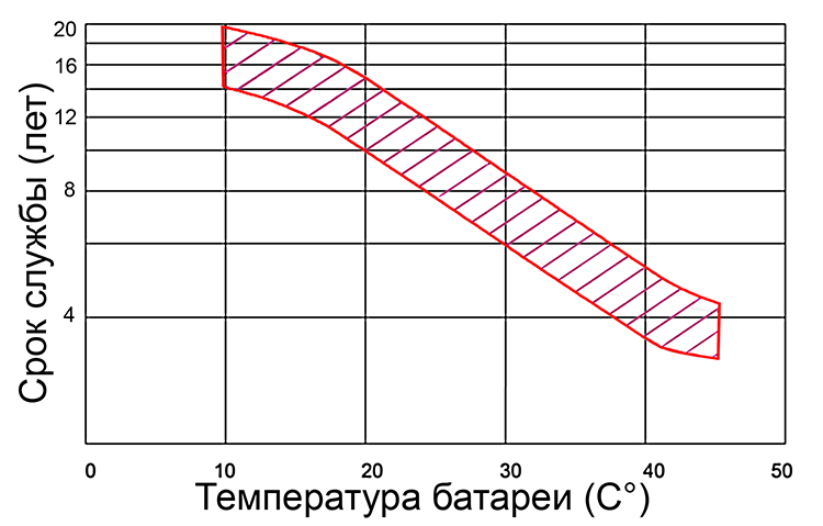 Оптимальна робоча температура акумулятора становить 25°С. Збільшення температури на 10 ° С, скорочує термін служби батареї майже наполовину.
