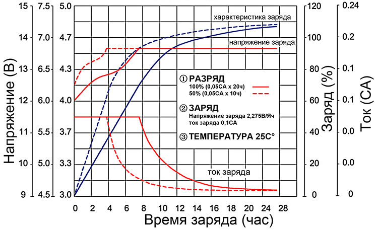 Розряд: розрядити 100% ємності батареї Заряд: максимальний струм заряду 0,3СА, постійна напруга 2,4-2,45В/комірку 24 години.