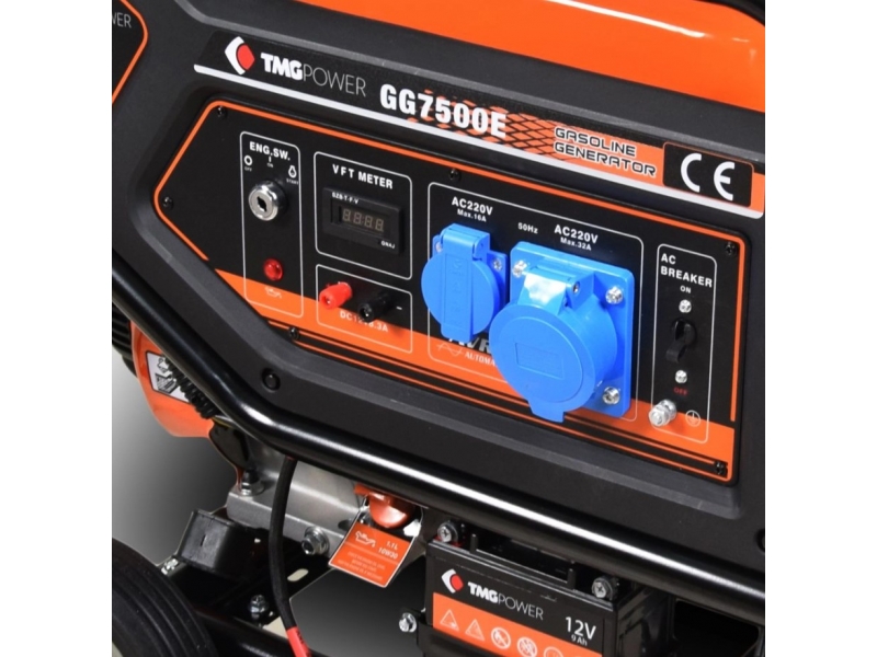 Бензиновий генератор TMG GG7500E потужністю 6,8кВA до складу якого входить перевірений часом двигун 190F з електростартером, розроблений на основі популярного двигуна HONDA GX390, виконаний відповідно до міжнародних стандартів якості, а рівень викидів вихлопних газів відповідає вимогам EPA та CE.