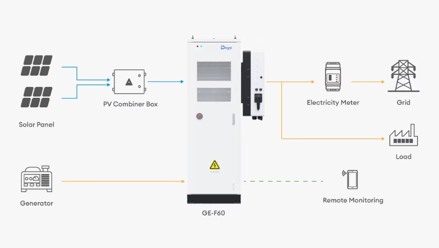 Deye GE-F60 – готове рішення, оснащене гібридним трифазним інвертором та модульними батарейними блоками, що дозволяють масштабування. Система вирізняється високою енергоефективністю, безпекою та надійністю. Крім того, вона підтримує інтелектуальні функції, зокрема віртуальну електростанцію (VPP), мікромережу, розумне планування споживання електроенергії та автоматизовані сценарії керування, що робить її ідеальним рішенням для оптимізації витрат на електроенергію.