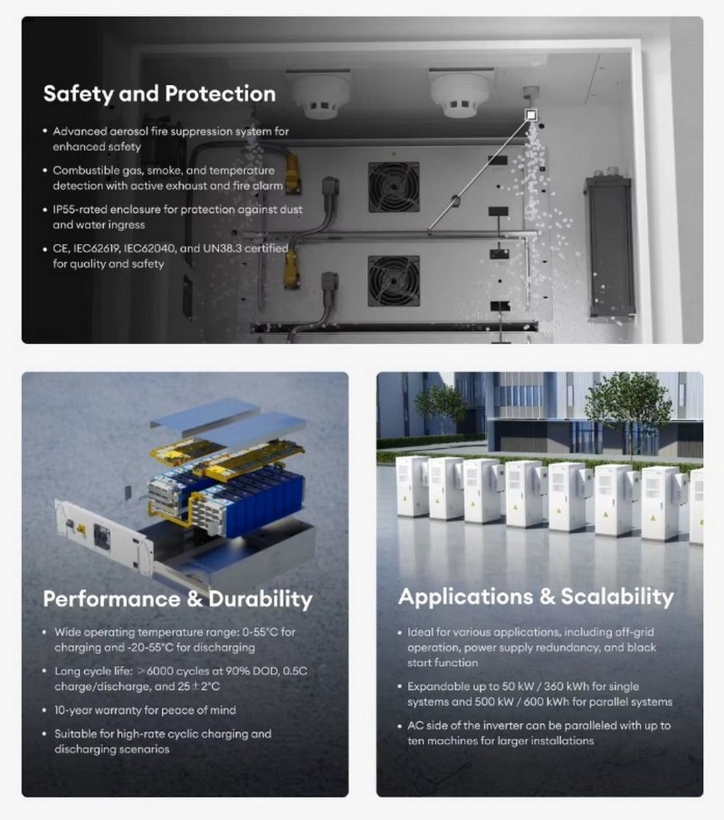 50-кіловатна електростанція гібридного принципу роботи типу все в одному включає в себе інвертор на три фази, акумулятор на 60 кВтг, блок управління, кондиціонер та шафу для розташування. Потребує збірки на місці.