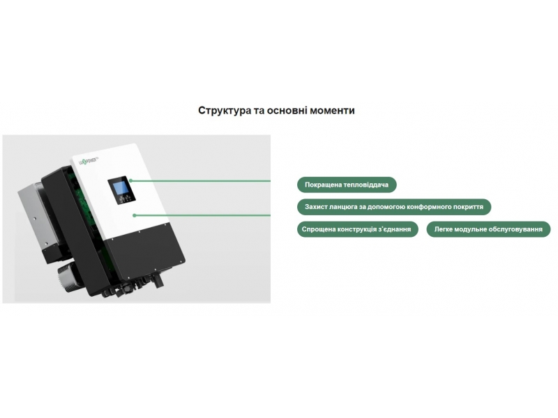 Покращене тепловідведення забезпечує стабільну роботу системи охолодження, покращуючи продуктивність інвертора в складних умовах експлуатації.
