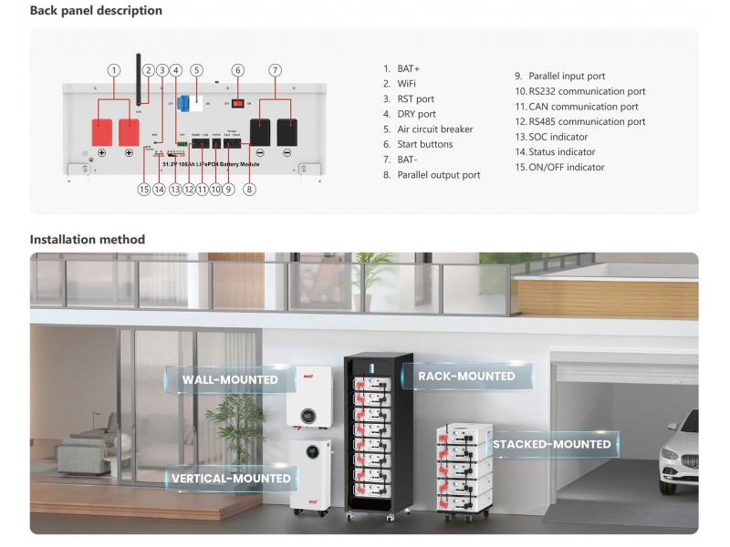 Компактне та зручне в монтажі рішення для накопичення енергії, створене з урахуванням різних сценаріїв встановлення. Пристрій підтримує три формати монтажу: настінний, штабельний (до 5 модулів) або стійковий (rack-mounted), що дозволяє максимально ефективно використовувати простір. Ідеально підходить для житлових будинків, телекомунікаційних об’єктів та невеликих комерційних систем без втрати продуктивності.