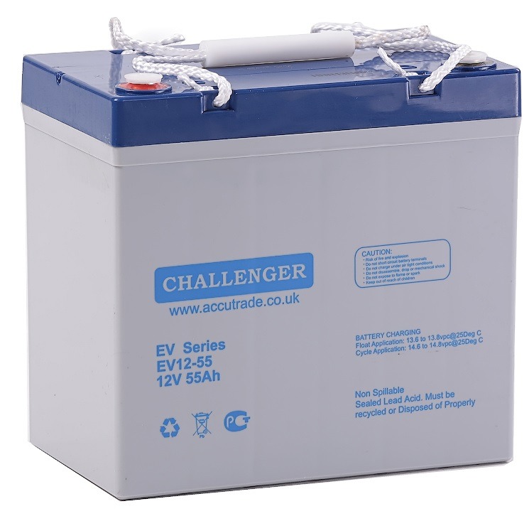 Акумулятор Challenger EV12-55 – свинцево-кислотна акумуляторна батарея, виконана за технологією AGM, призначена для частого глибокого циклічного розряду. У батареях серії EV використовується спеціально розроблена активна речовина та посилені пластини, що дозволяє їм забезпечити надійну роботу в умовах високого навантаження та понад 300 циклів при 100% глибині розряду (DOD).