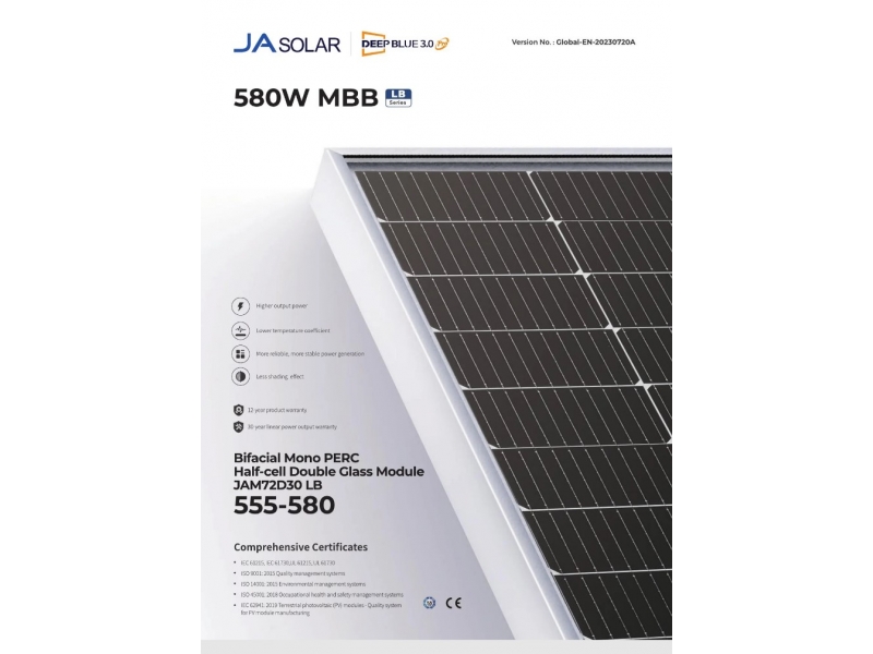 JA SOLAR 565 Вт JAM72D30-565/LB является частью их поколения модулей Deep Blue 3.0 X. Модули имеют двойное стекло Bifacial, оптимизированное для максимального поглощения света с передней и задней сторон. Их отличная эффективность и прочная конструкция делают их идеальными для коммерческих фотоэлектрических проектов, установок на крышах, а также новых секторов, например, для агрофотоэлектрической системы.