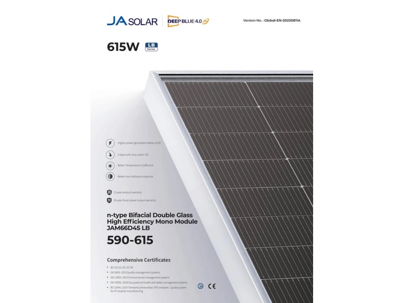 Солнечные панели JA Solar JAM66D45-615/LB являются высокоэффективными фотоэлектрическими устройствами, превращающими солнечное излучение в электрическую энергию. Они производятся компанией Ja Solar, одним из ведущих мировых производителей солнечных панелей.