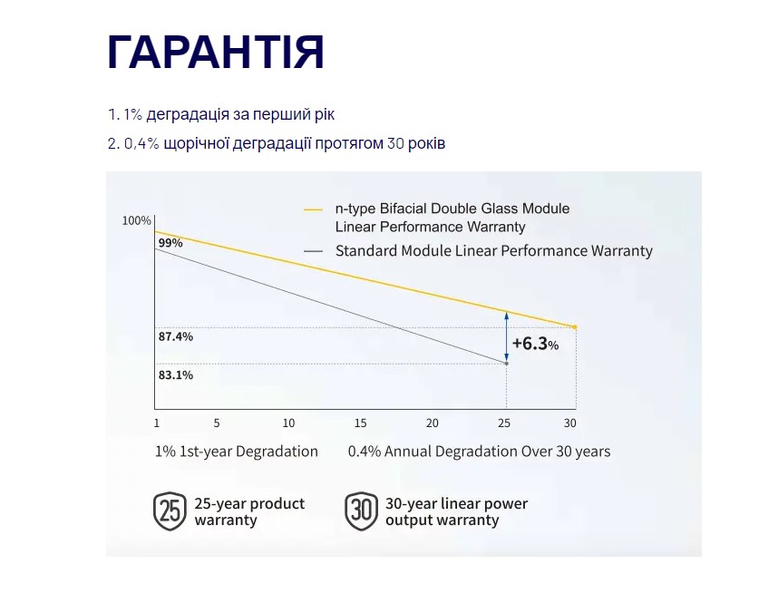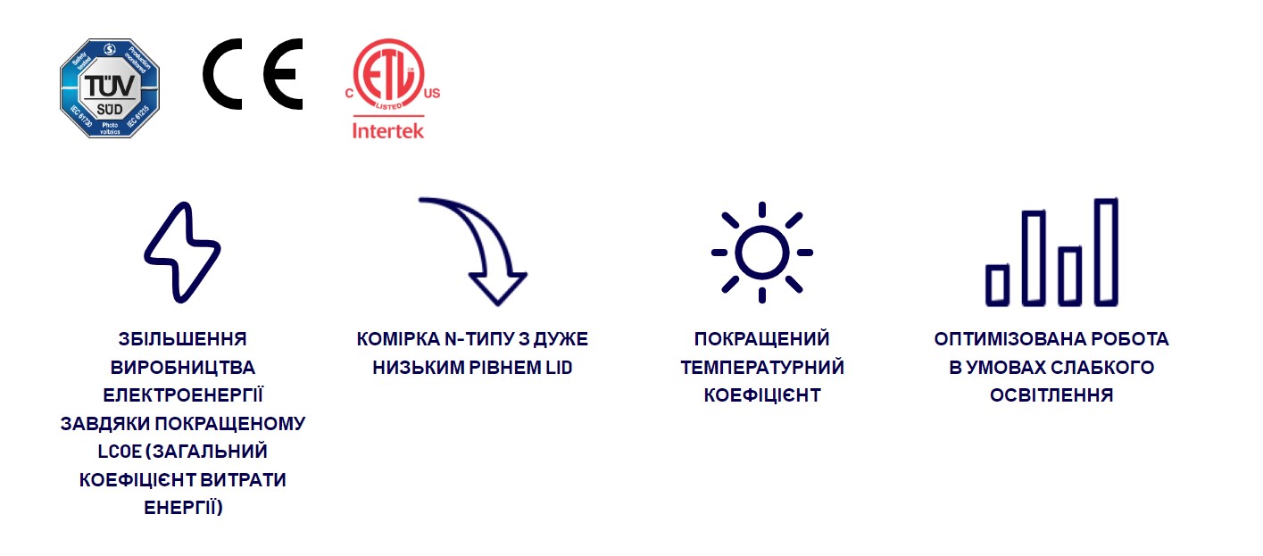 - Двухсторонний дизайн использует обе стороны модуля для генерации энергии, максимизируя выход энергии, особенно на отражающих поверхностях, таких как светлая земля или снег.