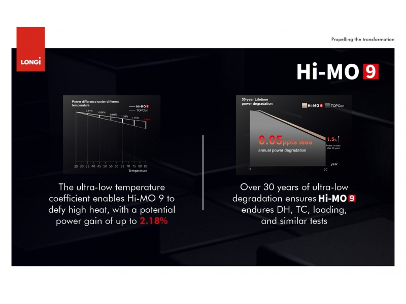 Longi Solar подчеркивает превосходную производительность и надежность Hi - MO 9, заявив: «Наш новый модуль Hi - MO 9 обеспечивает ведущее мировое производство электроэнергии и превосходит другие технологии на рынке при равном сценарии землепользования. Он сохраняет эту производительность на протяжении всего срока службы, предлагая владельцам заводов эффективнее всего использовать свою землю и высочайшую ценность солнечного света».