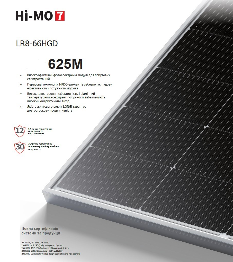 Монокристаллический фотоэлектрический модуль Longi Solar LR8-66HGD-625M Bifacial Hi-MO 7
