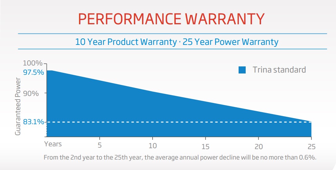 В течение почти 20 лет фотоэлектрические модули Trina были хорошо протестированы в полевых условиях и имеют устойчивую линейную гарантию на 25/30 лет, гарантирующую, что к 10 годам мощность будет составлять не менее 90%.