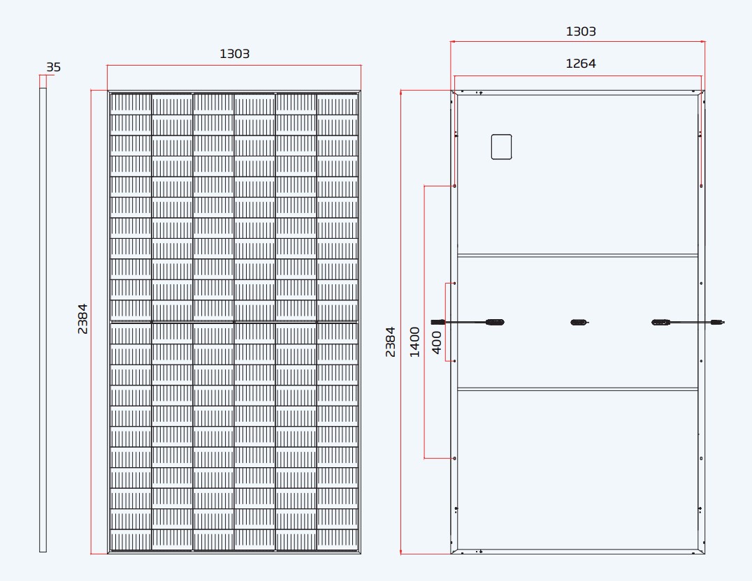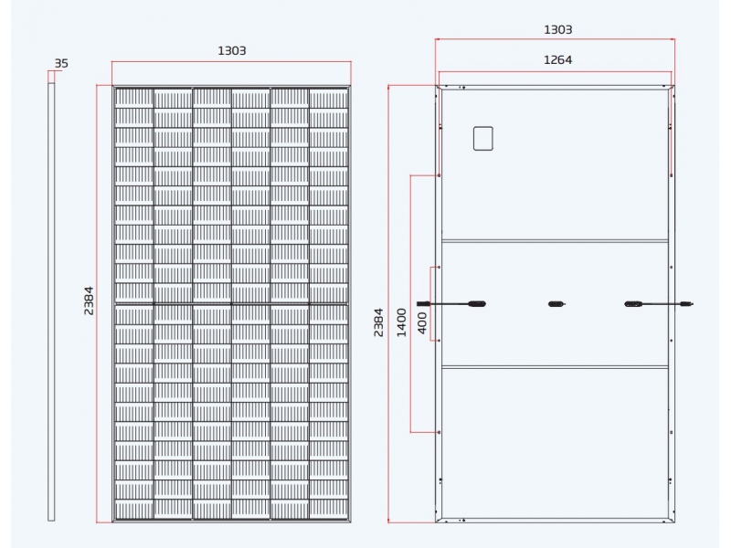Использует Half-Cell технологию. Это означает, что панель является условно разделенной на 2 части по 66 фотоэлементов. Общая площадь модуля (3.10 м. Кв.), А габариты 2384 мм Г— 1303 мм Г— 35 мм. Вес модуля - 33.9 кг. Модуль для лучшей стабильности с тыльной стороны оснащается двумя укрепляющими ребрами.