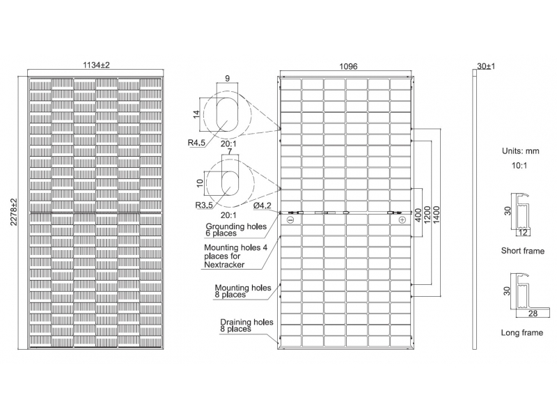 Поверх кремниевых пластин, преобразующих солнечное излучение в постоянный электрический ток, напечатаны девять токопроводящих струн (MBB, технология мультишинности). Тыльная сторона фотоэлементов покрыта тонким слоем перфорированного диэлектрика (PERC, технология пассивации заднего контакта эмиттера). Сзади и спереди пластины защищены закаленным стеклом с низким содержанием железа (Double Glass, технология стекло-стекло). Конструкция полностью герметична, устойчива к снежной нагрузке, воздействию ветра, влаги, пыли, града.
