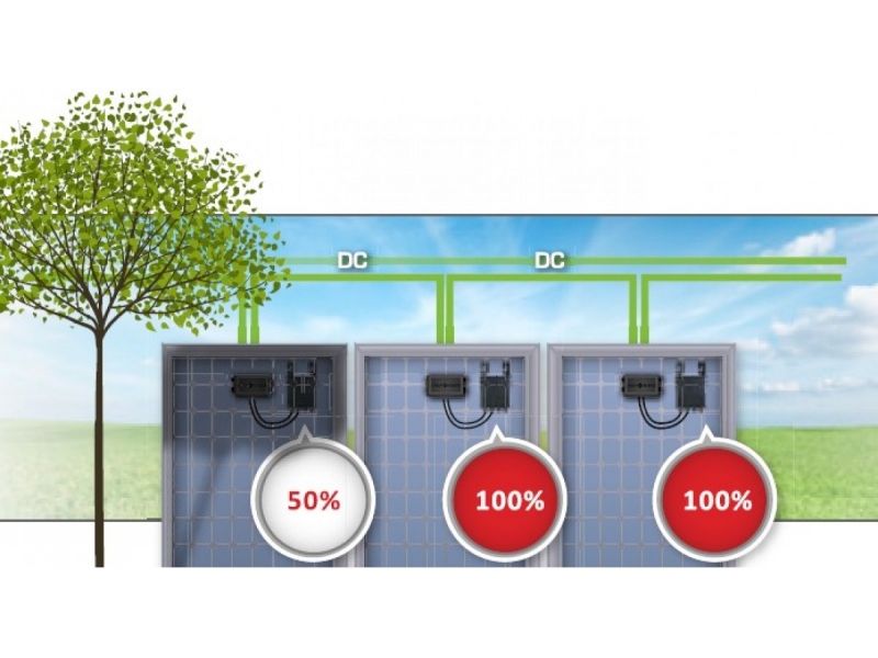 MPPT модуль дозволяє монтувати сонячні батареї одного стрінга на різних схилах, що не рекомендується робити з батареями без оптимізаторів. В результаті монтаж сонячних фотомодулів з використанням оптимізаторів напруги стає ще більш гнучким, зручним та ефективним. se1 Приклад роботи панелей із оптимізаторами. (Оскільки напруга кожного фотомодуля є фіксованою, загальна потужність системи несуттєво змінюється під час затінення одного з фотомодуля) se2