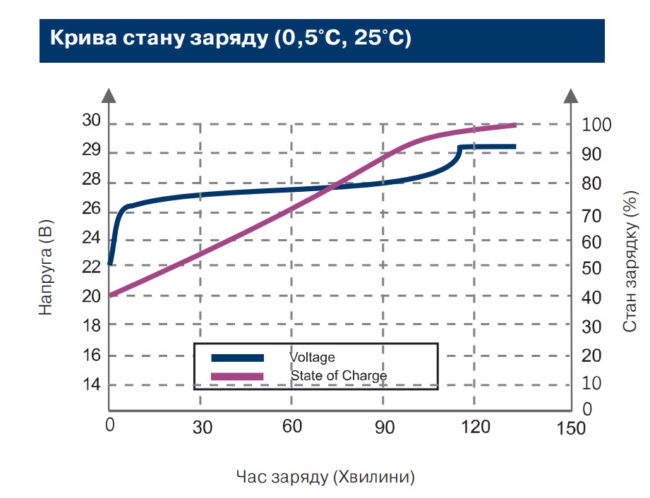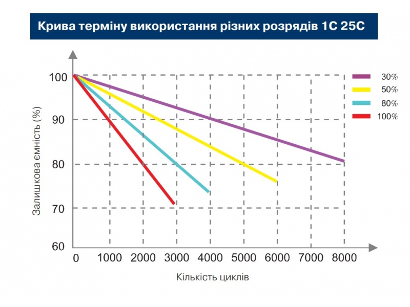| Кількість циклів заряд-розряд | 4000 циклів при 1С, DOD = 80%, SOH = 80%, > 6000 циклів при 0.25С, DOD = 80%, SOH = 80% |