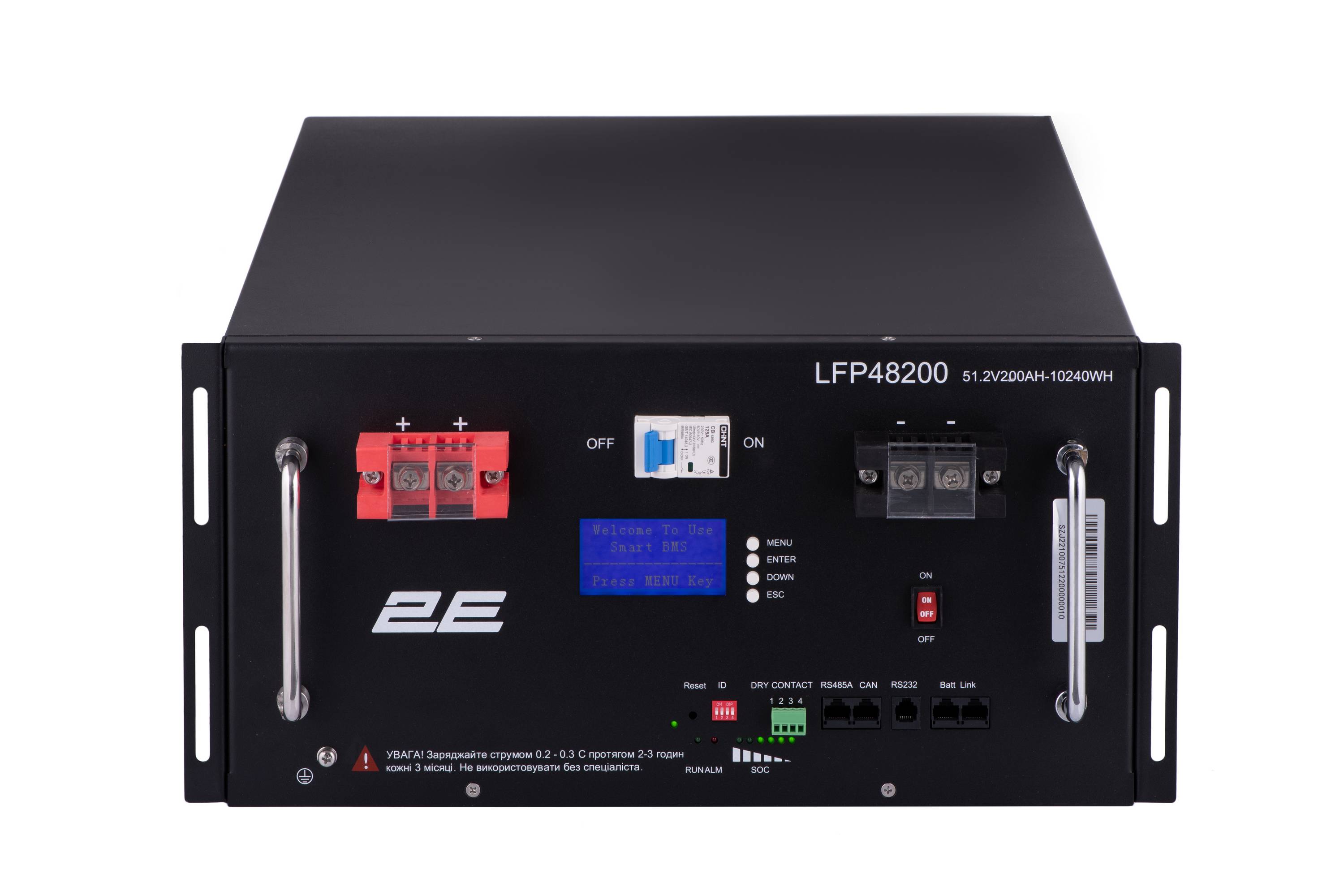 2Е LFP48200 – 48-вольтова акумуляторна батарея типу LiFePO4 з номінальною ємністю 200 Аг, LCD екраном та BMS контролером. Використовується в телекомунікаційних системах безперебійного живлення та альтернативної енергетики. Батарея має корпус для монтажу в телекомунікаційну стійку формату 19" і допускає паралельне підключення до 16 шт. Тривалий термін служби та великий циклічний ресурс при DOD 80% - понад 6000 циклів.