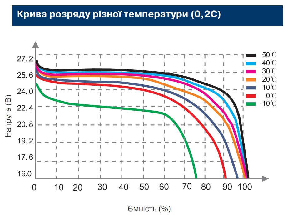 | Оптимальна робоча температура | -3°С - +65°С (заряд), -23°С - +65°С (розряд), +10°С - +25°С (рекомендовано) |