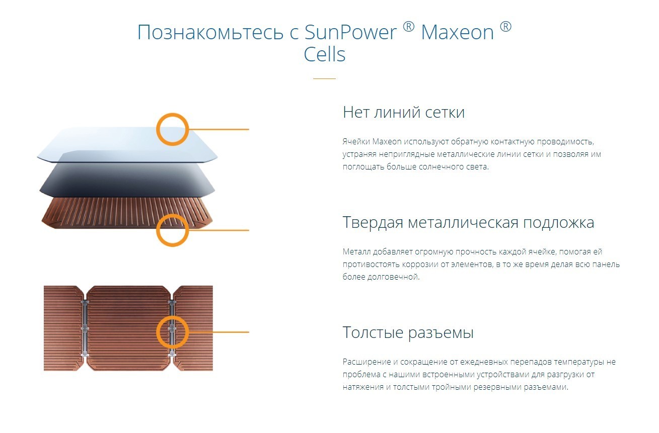 Значна унікальність сонячних модулів SunPower полягає в тому, що пластинчасті мідні стрічки замінені на гнучкі сполуки, а елементи в них з'єднані паралельно, на противагу послідовному з'єднанню. Це, у свою чергу, дає більшу ефективність вироблення електроенергії, коли на модулі тінь, сміття або бруд. Нижча пікова робоча температура елемента збільшує термін життя модуля, а матеріали, з яких він зроблений, запобігають PID (potential induced degradation), і захищають від зниження потужності вологістю.
