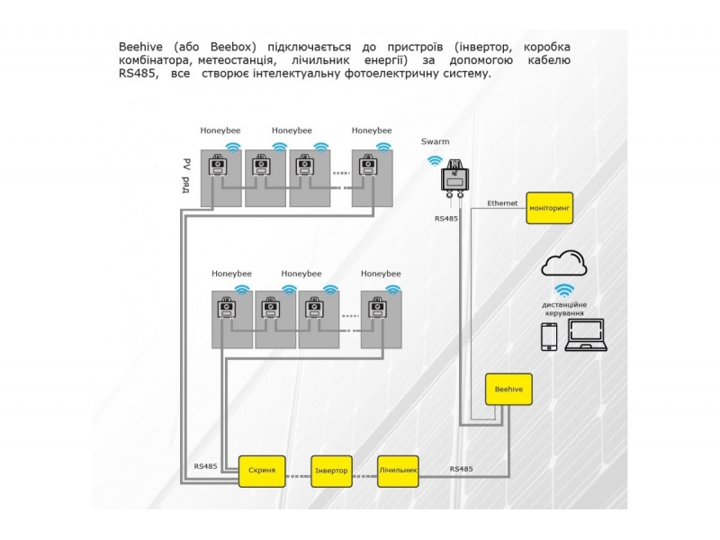 Q-Power Beehive підключається до Q-PowerSwarm та Data Cloud Center, узагальнює та завантажує інформацію про сонячне обладнання (фотоелектричний модуль/інвертор/лічильник електроенергії/прилад для моніторингу навколишнього середовища), яке робить сонячну систему інтелектуальною.