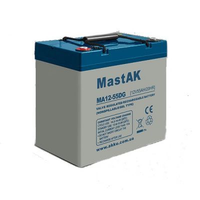 Mastak MA12-55DG батарея з технологією GEL призначена для безперебійного живлення тривалого розряду з терміном служби до 12 років. Технологія GEL – електроліт знаходиться у желеподібному стані. Скорочено VRLA (Valve Regulated Lead Acid, в перекладі з англ. Клапанно-регульовані свинцево-кислотні) або SLA (Sealed Lead Acid - Герметизовані свинцево-кислотні).